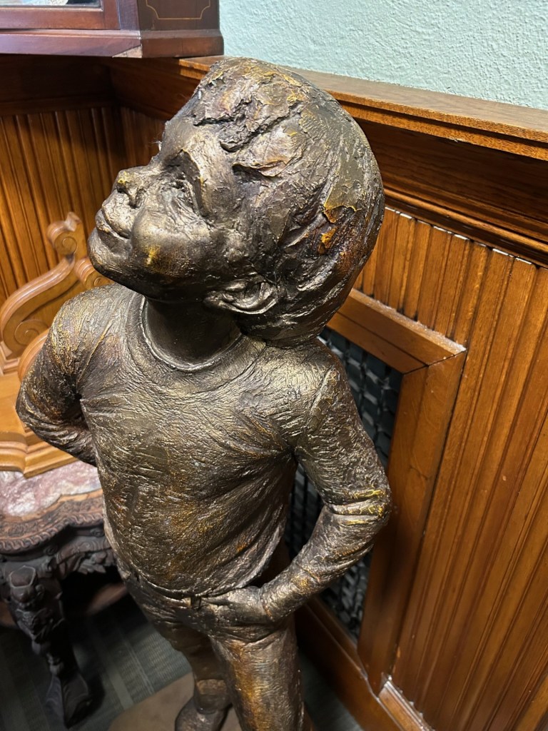 This is the working copy of the boy in what is now the Christos G. Rouses Memorial for officers lost in the line of duty, the bronze which is on John F. Kennedy Plaza, behind the library, directly in front of the police department. It features an officer with his hand on the should of a young child and features the names of Office Rouses and other fallen Lowell officers.