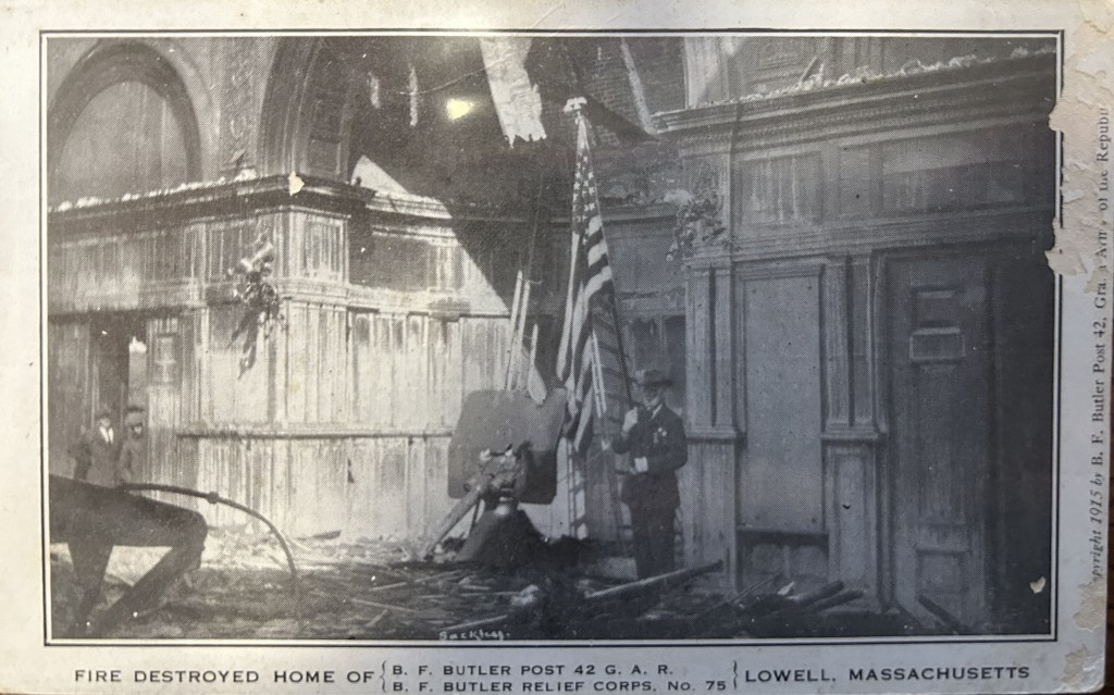 The library remained majorly unchanged until 1915. Midmorning on March 1, 1915 a fire started in the upper level card/smoking room on the third floor in a space above Memorial Hall. There were multiple theories including unattended smoking materials, faulty wiring, but the wire inspector disputed that. Memorial Hall was a complete loss and Civil War artifacts were lost. The Lowell Historical Society, which was in what is now the Directors’ Office had archives and artifacts affected (they still have some books that smell of the fire in their collection). The rebuild was taken shortly after and Memorial Hall was changed from the original design.