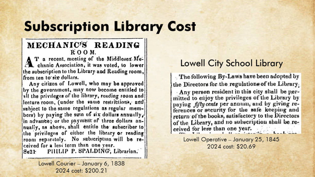 The concept of a “free” library was limited at the beginning of public libraries, but to give you an example of costs the subscription for the Merrimack Mechanics’ Reading Room was $6/yr (about $200 in today’s dollars) and the library was $.50 or about $20 in 2024 funds. Henry Miles’ Lowell as it was and as it is referenced it as a bargain in 1845.