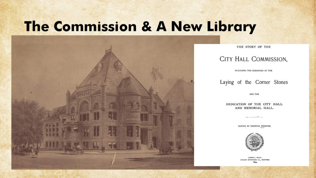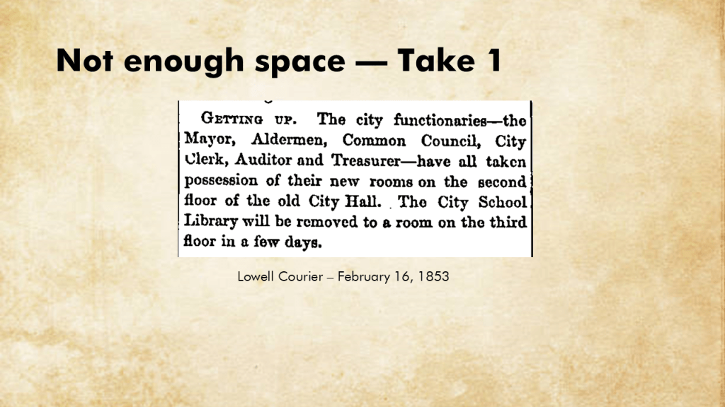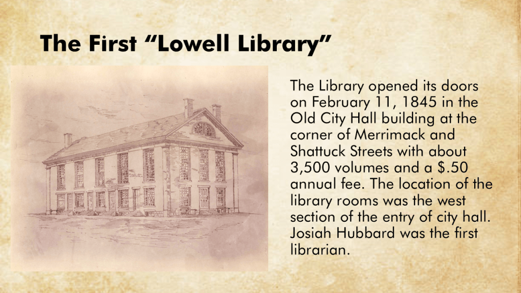 The Old Residents’ Historical Association of Lowell had about 500 volumes in 1890 and its library was held in the office of Alfred Gilman, Esquire. It had a very limited number of patrons. It eventually evolved into the Lowell Historical Society and what remains of that early collection is housed at the Center for Lowell History in the Mogan Center.