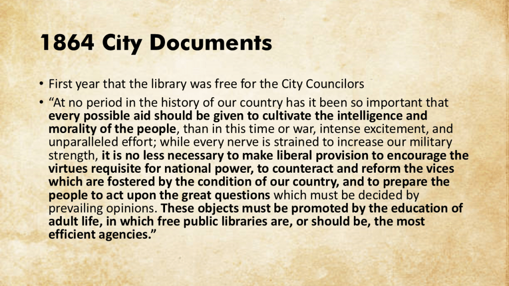 In 1864, it was voted to make the library free to the City Councilors because “every possible aid should be given to cultivate the intelligence and morality of the people… it is not less necessary to make liberal provision to encourage the virtues requisite for national power, to counteract and reform the vices which are fostered by the condition of our country, and to prepare the people to act upon the great questions… these objects must be promoted by the education of adult life, in which free public libraries are, or should be, the most efficient agencies.”
