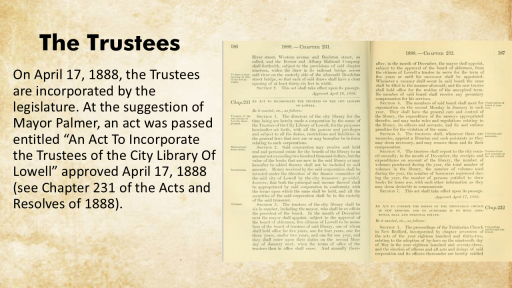 Another ordnance was introduced in 1886, with the choice of the Librarians was removed from the City Council and placed in the hands of the directors. On April 17, 1888, the Trustees were incorporated by the legislature. At the suggestion of Mayor Charles D. Palmer, an act was passed entitled “An Act to Incorporate the Trustees of the City Library of Lowell,” which was approved.
