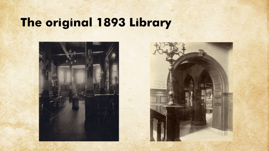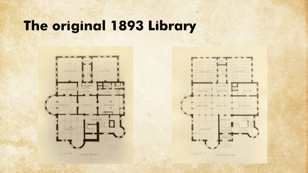 The current library when it first opened was only the ground and first floors with the stacks in the back of the building. Memorial Hall the third floor space above it were not used by the public. There were a number of reading rooms, newspaper files, reference room, and other file spaces for the public. The stacks were closed and anyone requesting an item, needed to put a request in with the delivery clerks.