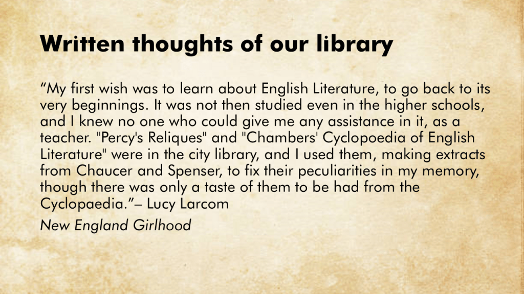 While our library and its impact has been documented in various places, here is a selection of writings from various Lowell residents.