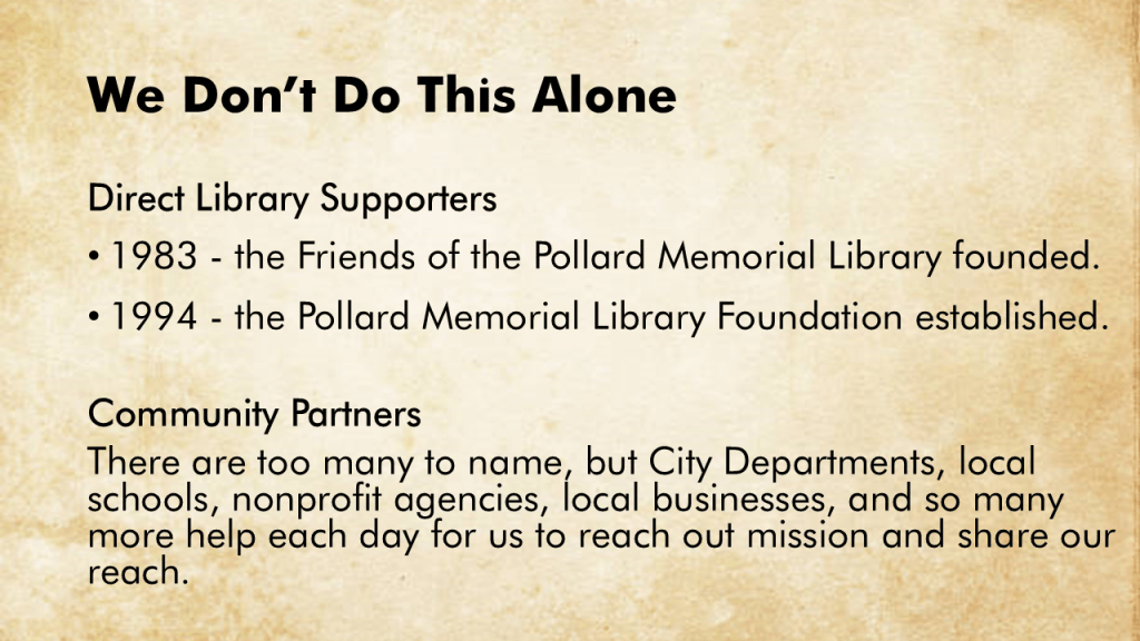 The library, while supported by the city, has two additional nonprofits that support us. We are grateful to the Friends and Foundation who host fundraisers, sponsor programs like our museum passes, arts and crafts, and more to guarantee that we are able to provide great opportunities for our community. We are also grateful for the many City departments, academic institutions, businesses and local nonprofits who provide us with guidance, support, ideas, space, and more to offer unique experiences to Lowell residents.