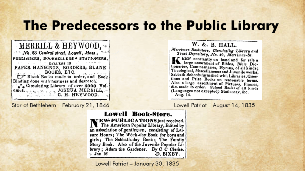 - Lowell Circulating Library at Lowell Bookstore – Tyler’s Building – 1834