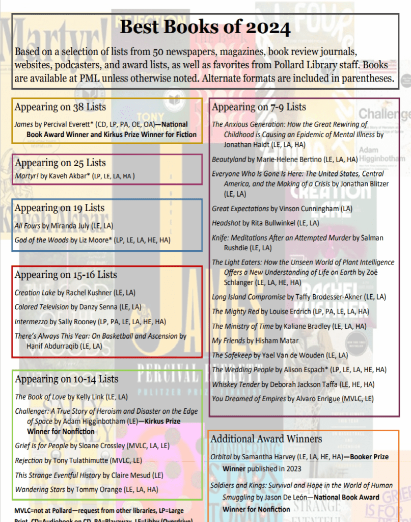 Many great books were published in 2024. If you are looking for more options, click on the image below. It includes books that appear on at least 5 lists as well as staff picks. It also indicates which books are available in alternate formats such as Large Print, Audio, Overdrive/Libby, and Hoopla.